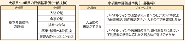介護プロフェッショナルの「できる(実践的スキル)」のチェック項目は合計148項目。施設、在宅で共通に使える基準が目指されています。基本介護技術の評価、利用者視点での評価、地域包括ケアシステム&リーダーシップの3つの大項目の下に中項目、さらにその下に小項目があります。(評価基準例・下記参照)評価方法は、すべて「現認」が基本。アセッサーの前で対象となるチェック項目の介助を行い、本人とアセッサーがそれぞれできているかをチェックする仕組みです。チェック項目は、「できる」「できない」「実施していない」の3段階評価。評価階数の基本介護技術については原則2回以上(訪問介護は1回でも可)。チェック項目の8割以上が「できる」で、かつ「できない」「実施していない」の項目がない場合に小項目クリアとなります。すべての小項目が「できる」場合に、中項目を「できる」と評価。すべての中項目が「できる」だった場合、レベル認定される仕組みとなっています。