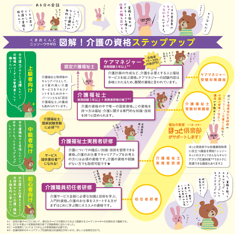 介護のお仕事をしていく中で、もっとスキルアップしたい!成長したい!…けど、どんな資格があるの?と思われているスタッフの皆様へ、初級・中級・上級に分けて、介護の現場で活かせる資格についてご紹介します!