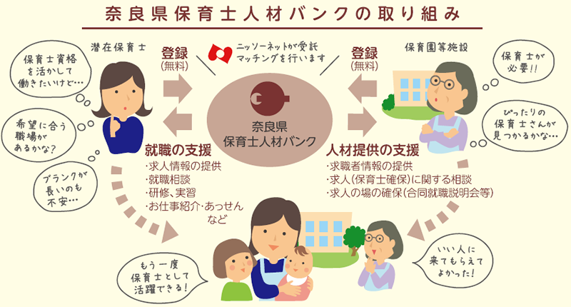 いま、保育士不足が課題となっている全国の自治体では、主に潜在保育士(資格をお持ちで、保育の仕事をされていない方)の職場復帰をサポートするための組織づくりが進められています。名称は自治体により異なりますが、「保育士人材バンク」や「保育士・保育所支援センター」が一般的です。ニッソーネットは民間企業としては唯一、その運営を任され、平成25・26年度は大阪市より、平成26~29年度は奈良県より受託を受けています。