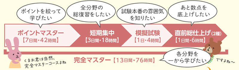 全授業がセットになった完全マスターコースから直前対策まで、目的や 時間に合わせてコースが選べます。