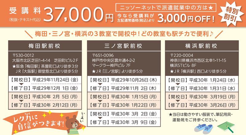 ※お申込みは先着順となり、定員になり次第締め切らせて頂きます ※すでにお申込み頂いている場合でも、最低開校人数に満たない際は開校中止となる場合がございます ※遅刻・早退及び欠席により規定の時間数を満たさない場合には修了証が発行できない場合があります。