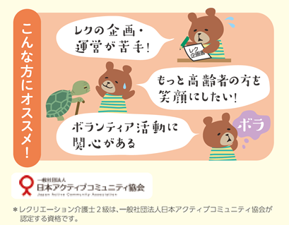 現在、介護現場では高齢者の方が「喜びや生きがい」を持ち、心身ともに元気で過ごすために、「レクリエーションの質」が求められています。ほっと倶楽部の「レクリエーション介護士2級」では、介護の基本的な知識や高齢者とのコミュニケーションを身につけ、安全かつ楽しんでいただけるレクリエーションを実現する企画方法や現場での実践方法を学べます。