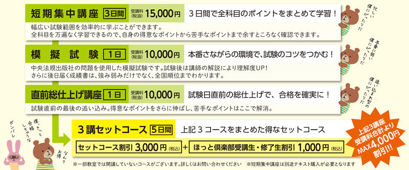 ※一部教室では開講していないコースがございます。詳しくはお問い合わせください ※短期集中講座は別途テキスト購入が必要となります