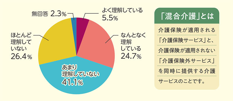 保険サービスと保険外サービスの区別を理解していない介護スタッフは約7割(67.5%)と、認知の低い結果となりました。「混合介護」の規制が緩和されるようになった際に介護現場で混乱が起きないよう、今から周知が必要です。