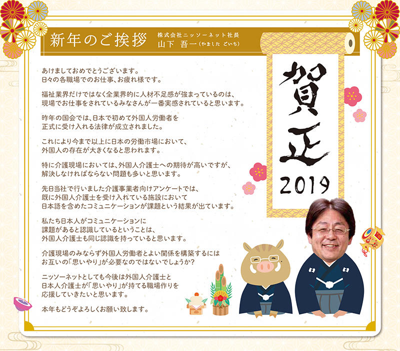 ニッソーネットスタッフの皆さま、あけましておめでとうございます。本年もどうぞよろしくお願いします。新春初回のケアフレンズでは、ニッソーネット社長の山下より皆さまに新年のご挨拶を申し上げます。