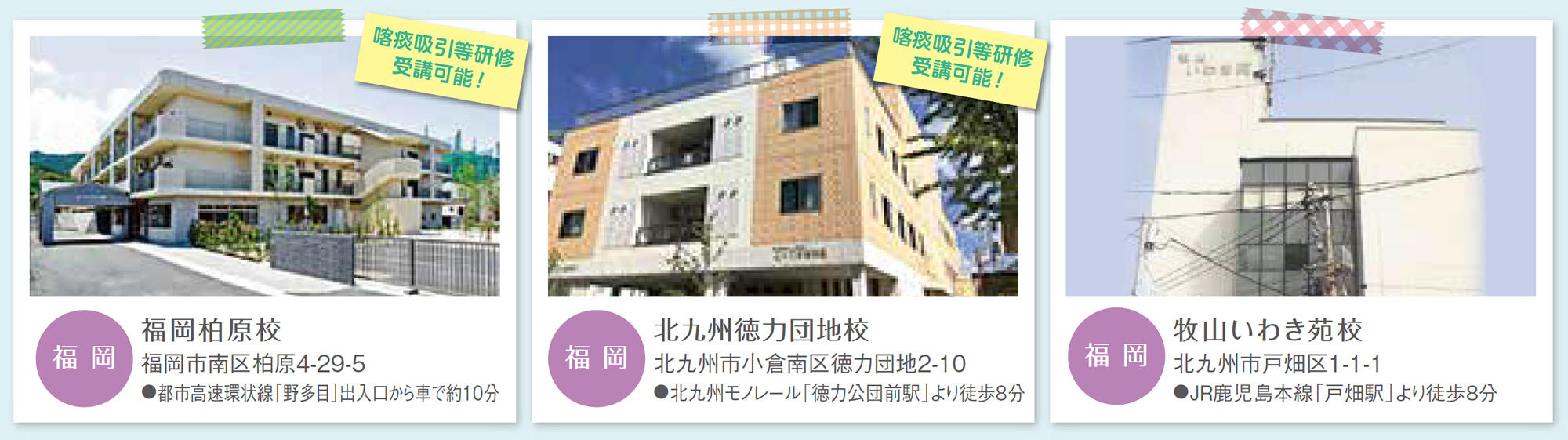 福岡エリアでは介護福祉士実務者研修を受講できる教室が増えました!福岡柏原校、九州徳力団地校では喀痰吸引等研修の受講も可能です。ご検討の方はぜひ、ご利用ください!