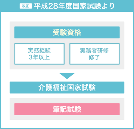 平成28年度介護福祉士国家試験より、実務経験3年以上に加え、実務者研修の修了が義務付けられています。