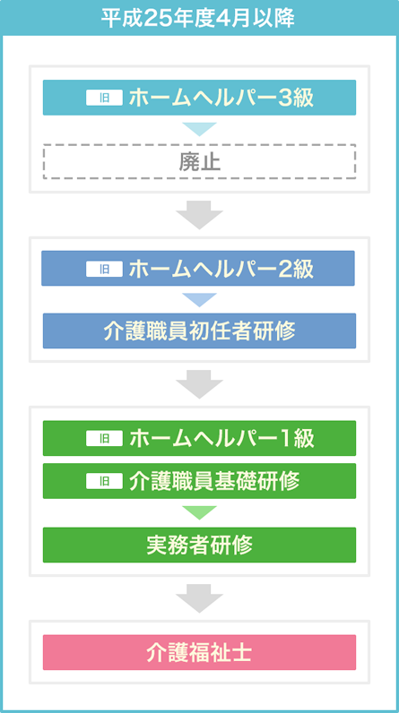 また、非常に複雑だった介護職のキャリアアップのルートを統一する役割も担っています。 国の方針としては今後のキャリアパスを「介護職員初任者研修→実務者研修→介護福祉士」が基本としており、今までは介護の資格として「ホームヘルパー1級・2級」「介護職員基礎研修」が広く知られていましたが、平成25年度4月から「ホームヘルパー2級」は「介護職員初任者研修」に名称・内容とも変更となり、「介護職員基礎研修」および「ホームヘルパー1級」の養成は役目を終え、新たにこの実務者研修が創設されました。