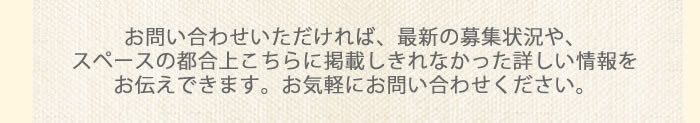 お問い合わせいただければ、最新の募集状況や、スペースの都合上こちらに掲載しきれなかった詳しい情報をお伝えできます。