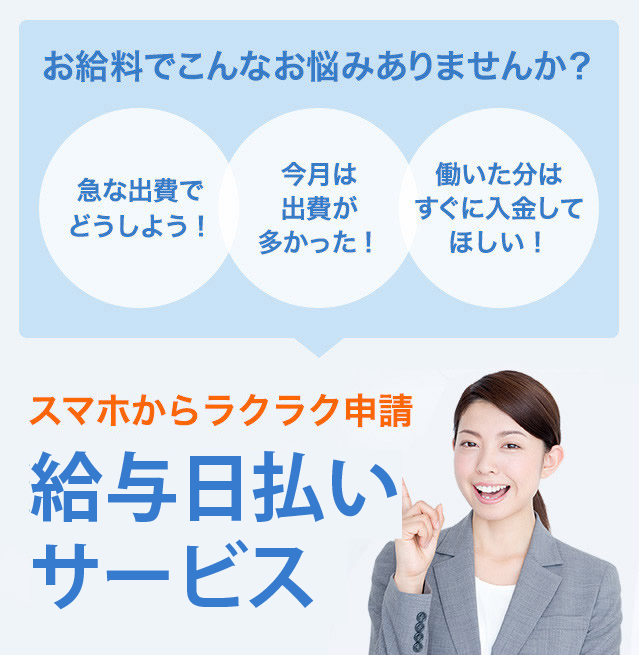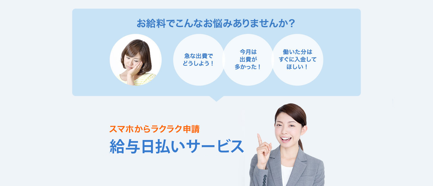 通常の給与支給日よりも早いタイミングですでに働いた分の一部を受け取ることができます。※条件によっては支払えないケースもございますので詳しくはお問い合わせの上、ご確認ください。