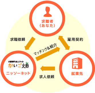 当社では、求職者様と介護事業所様との間に立って、ご希望にあわせてマッチングしていく「職業紹介サービス」を提供しています。
